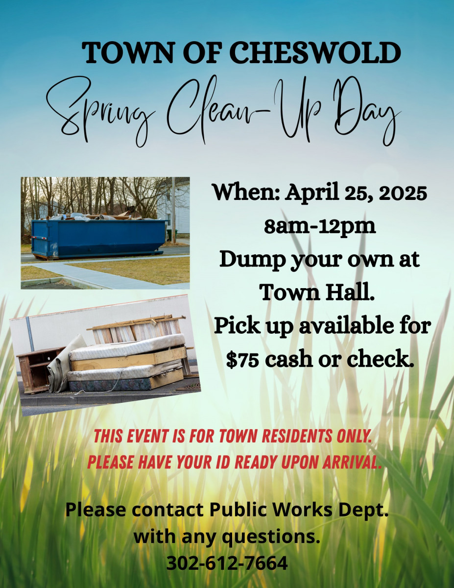 On April 27th, 2019, Cheswold encouraged its residents to participate in a town-wide clean up effort. Residents were able to clean up any unwanted items that had been in their homes or yards and were perhaps more difficult to get rid of than regular trash. The Public Works Department worked with residents, allowing special pick-ups to be scheduled for larger items.